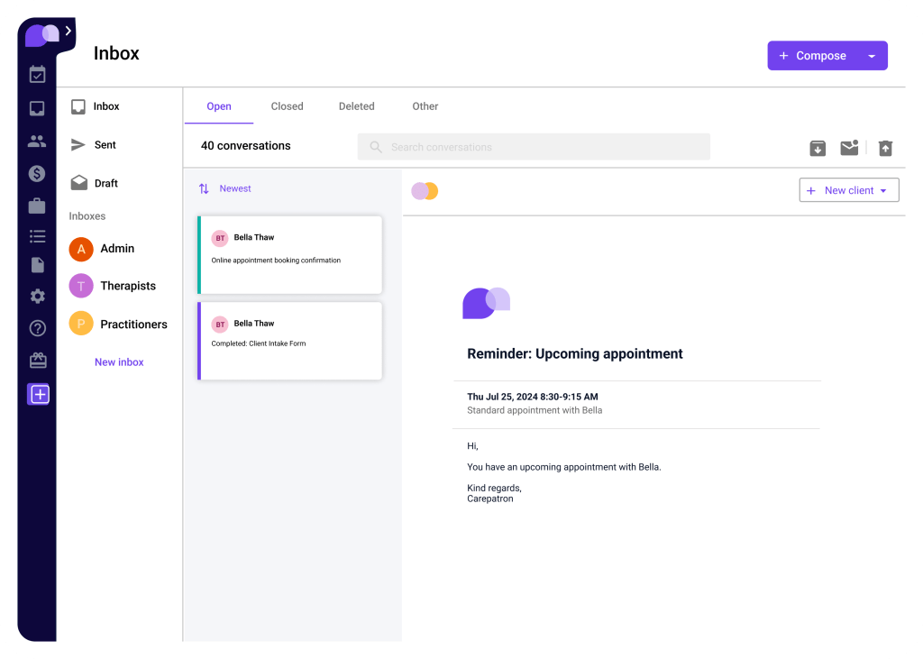 Unlike traditional clunky software, Carepatron offers a sleek, modern interface designed for speed and ease. Everything is accessible from one place, with no learning curve or complex onboarding. The design is not only visually pleasing but functionally intuitive—supporting a stress-free experience for practitioners and clients alike.