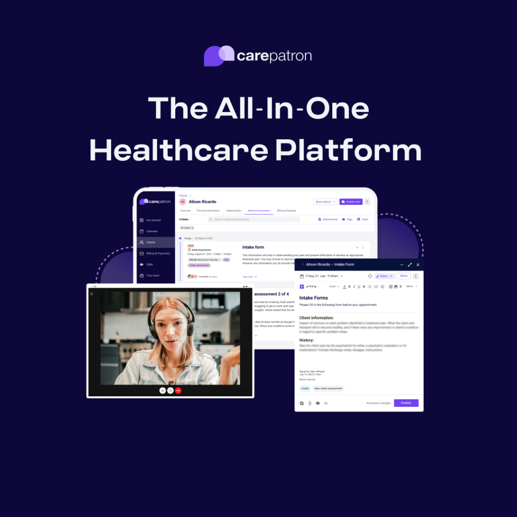 🖥️ Visual overview: Carepatron’s unified platform for telehealth, EHR, and practice management.